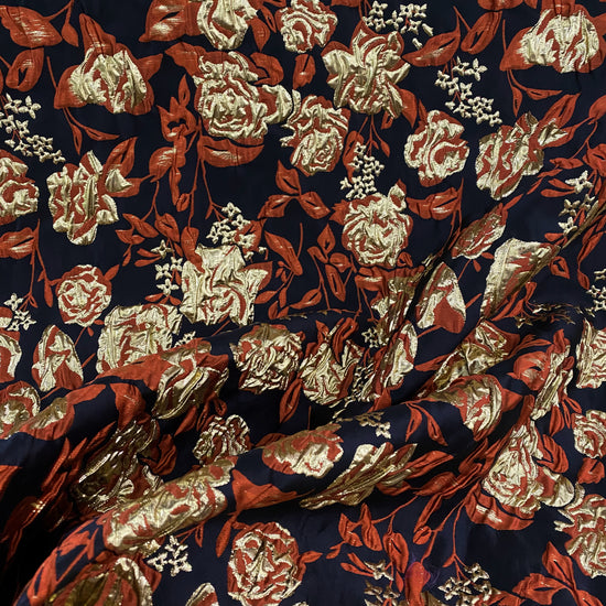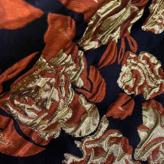 Polyester-blend Satin Brocade in Gold/Midnight Blue/Dark Orange. This heavyweight fabric has been tightly woven in a satin brocade structure; featuring a metallic floral motif with a raised, rippled handle. It has a structured drape, opaque coverage, and no stretch.