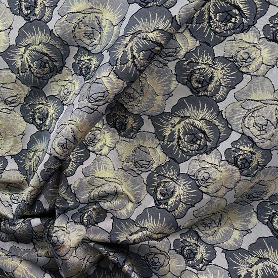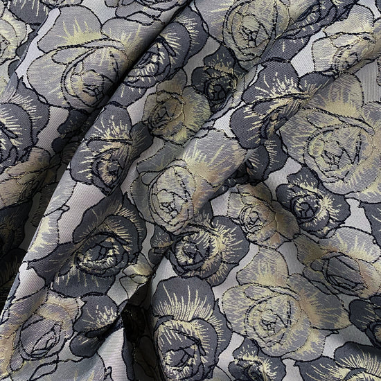 Polyester satin brocade in Silver/Slate Grey/Gold. This heavy weight fabric has been tightly woven in a satin brocade structure; featuring a metallic floral motif with a raised edge. It has a structured drape, opaque coverage, and no stretch.