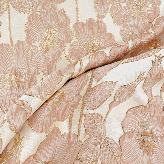 Polyester-blend brocade in White/Gold/Light Goldenrod. This heavyweight fabric has a tight brocade structure with a metallic edged floral motif, and a raised, rippled handle. It has a structured drape, opaque coverage, and no stretch.