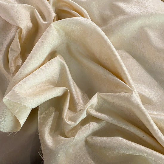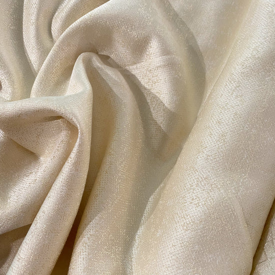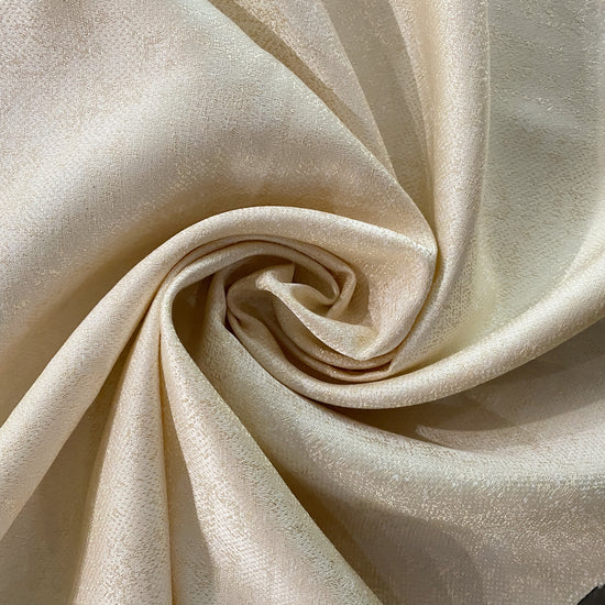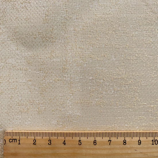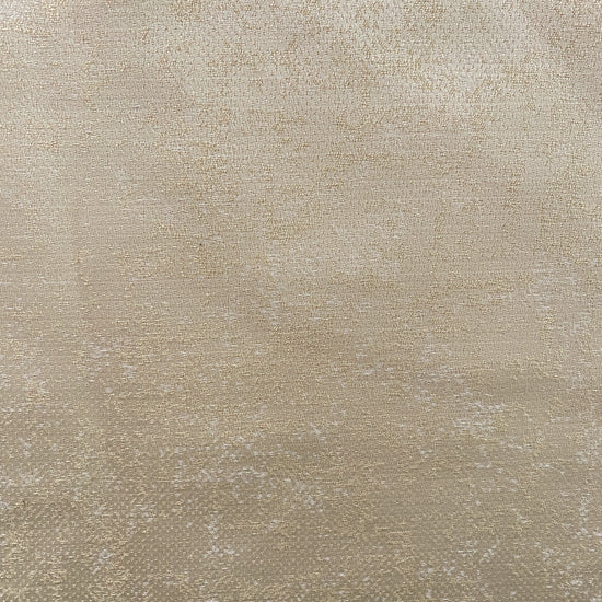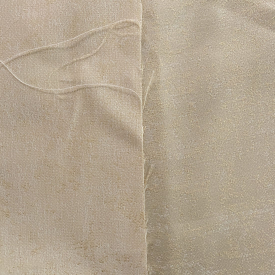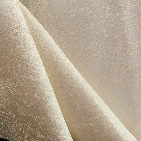 Subtle cream and gold patina motifs. A medium weight jacquard with a soft sheen and subtle metallic detailing. It has a structured drape, no give with a light upholstery handle.