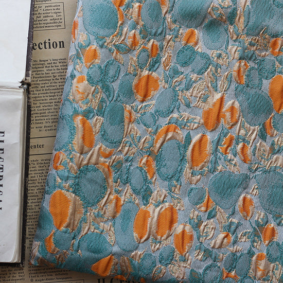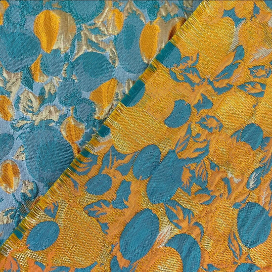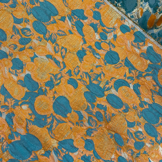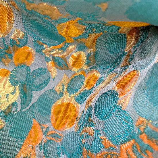 Polyester-blend brocade in Gold/Orange/Teal. This heavyweight fabric has a relaxed brocade weave with floral motifs, metallic accents, and a rippled handle. It has a structured drape, opaque coverage, and no stretch.
