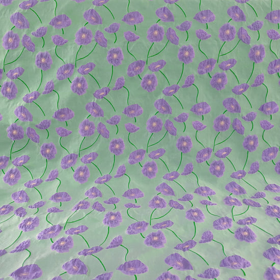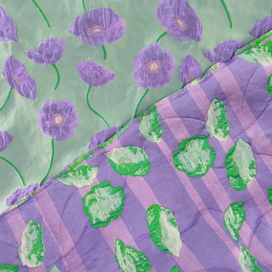 Polyester blend jacquard in pale green/light purple. This medium weight fabric has a fine jacquard weave with raised, rippled floral motifs and a subtle lustre. It has a semi-structured drape, opaque coverage, and no give.