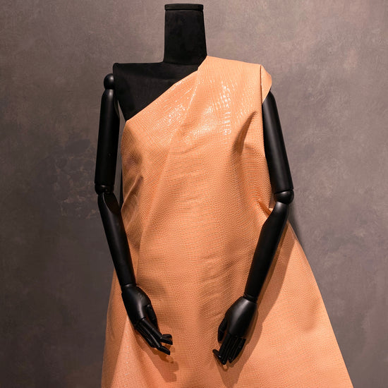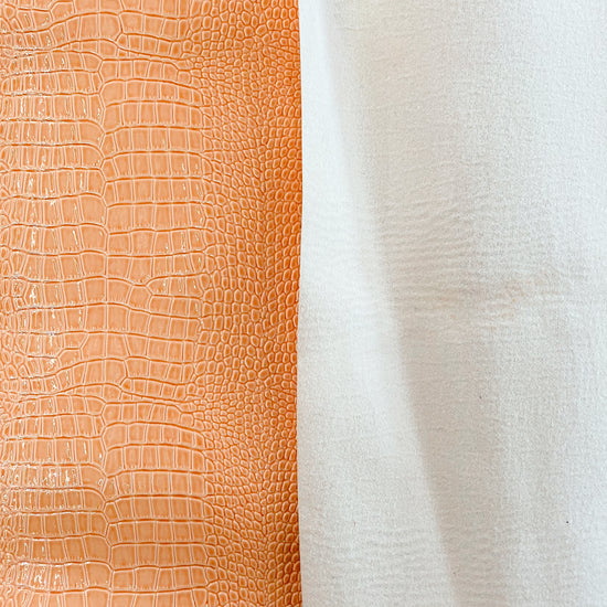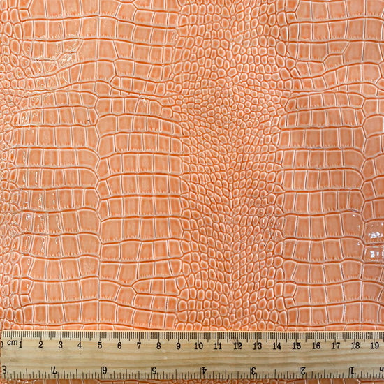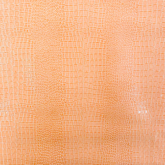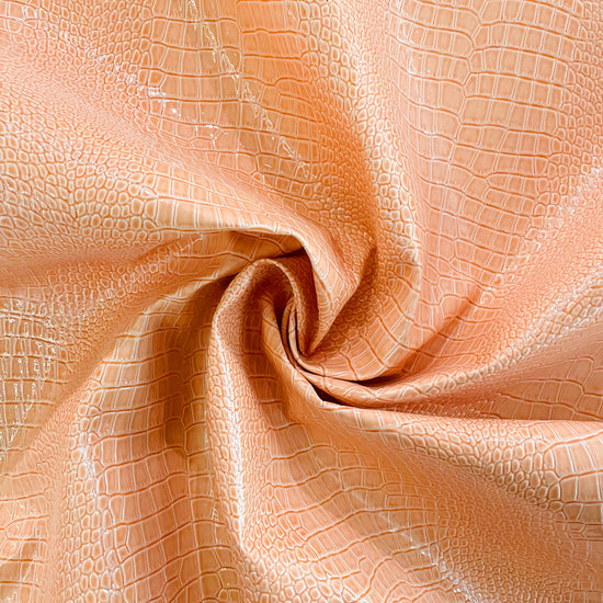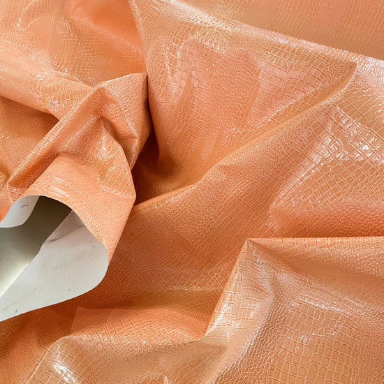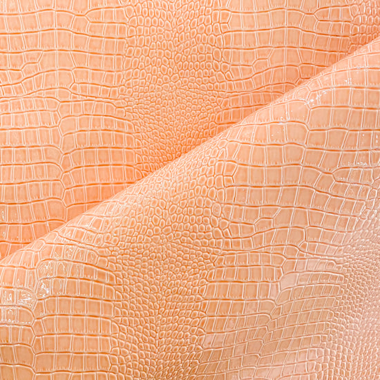 Patent Crocodile Faux Leather in Peach. This heavy weight faux leather has an embossed crocodile motif with a glossy patent finish. Bonded to a non-woven backing, it has a stiff drape, opaque coverage, and no stretch.