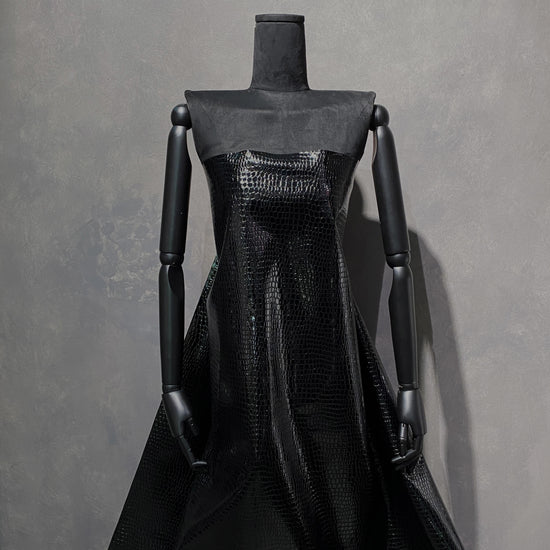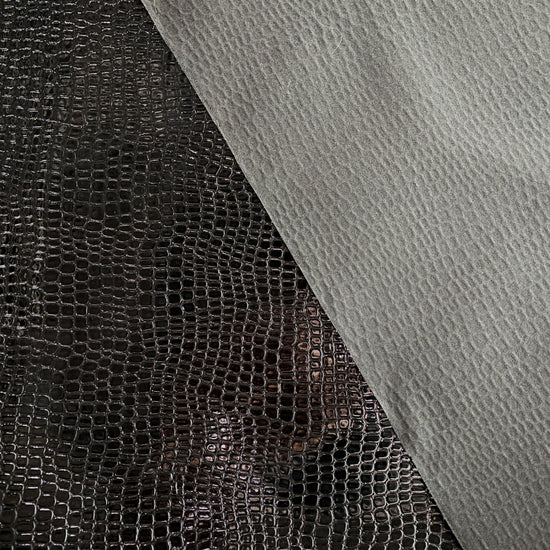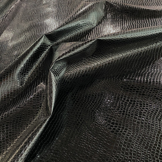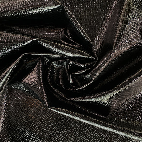 Patent Crocodile Faux Leather in Black. This heavy weight faux leather has an embossed crocodile motif with a glossy patent finish. Bonded to a non-woven backing, it has a stiff drape, opaque coverage, and no stretch.