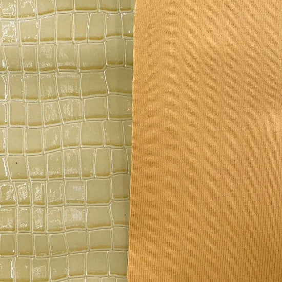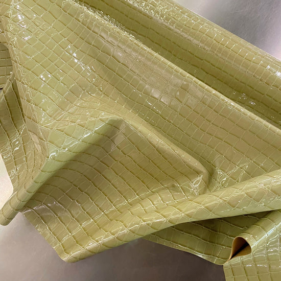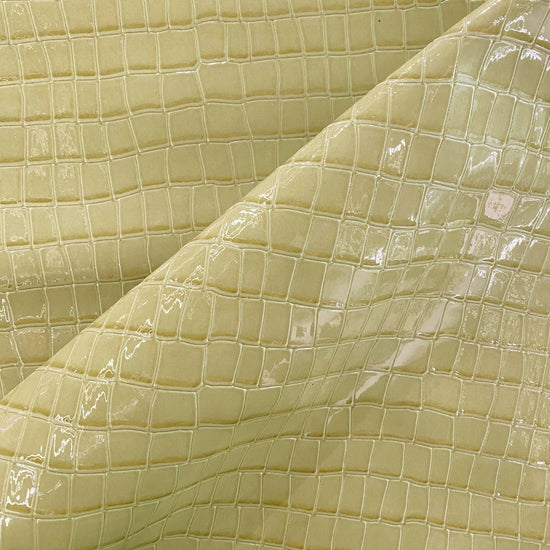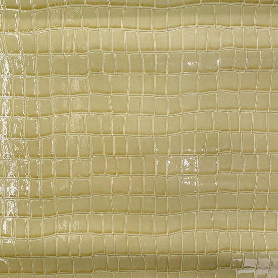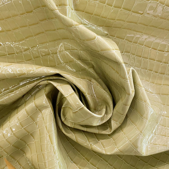 Alligator Faux Leather in Pale Olive. This heavy weight faux leather has an embossed alligator motif with a glossy patent finish. Bonded to a non-woven backing, it has a stiff drape, opaque coverage, and no stretch.
