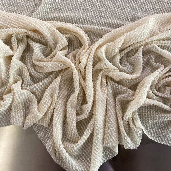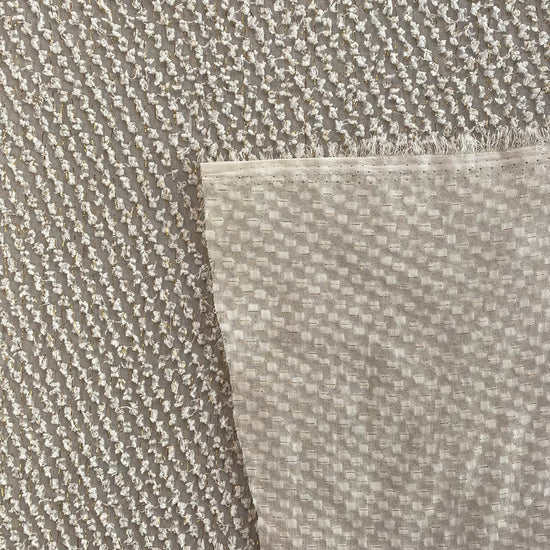 Soft sheer light weight polyester with small tassels containing gold lurex thread, light cream in colour.