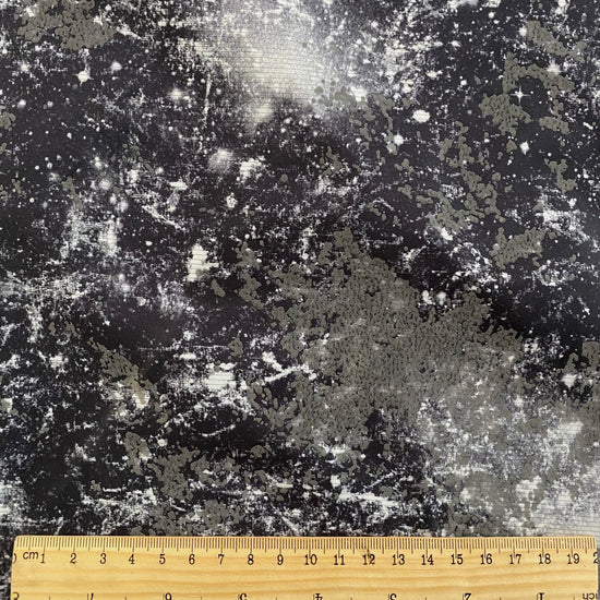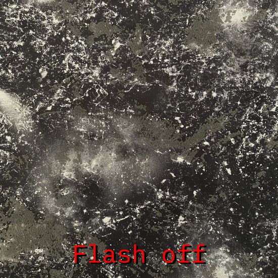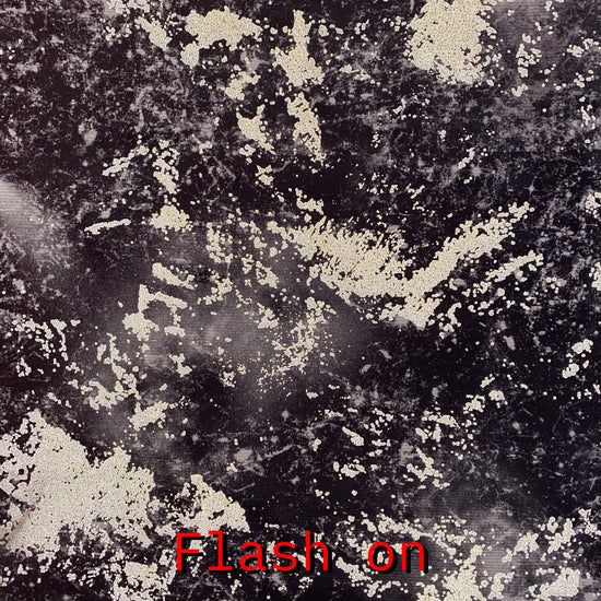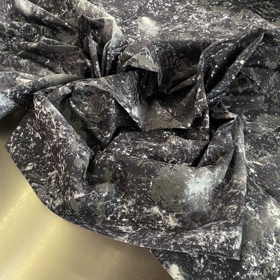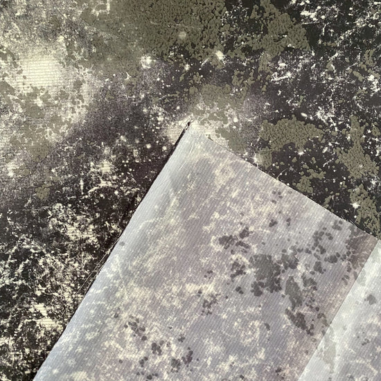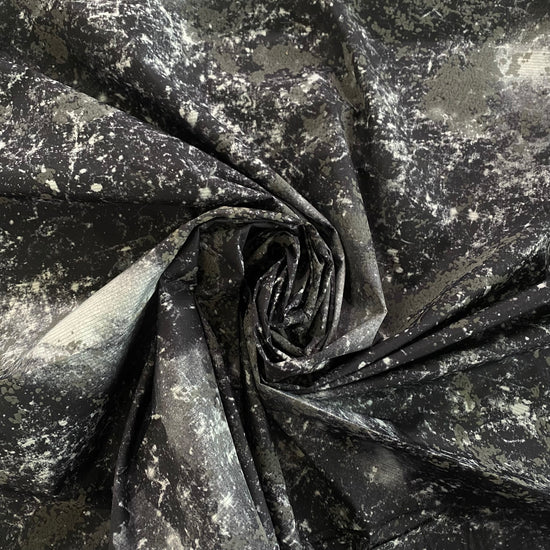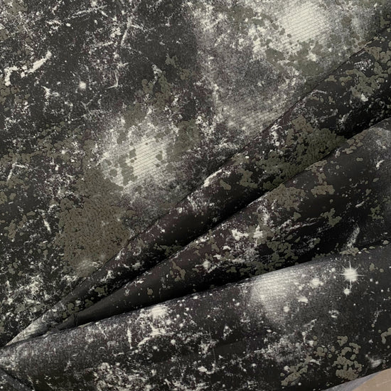 Lightweight technical twill polyester fabric with abstract pattern. There is a reflective spot treatment in abstract splotches throughout the fabric; these graphene spots brighten from grey to white when exposed to harsh light.