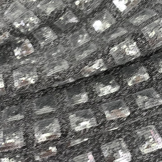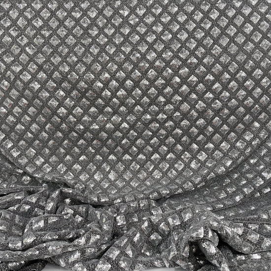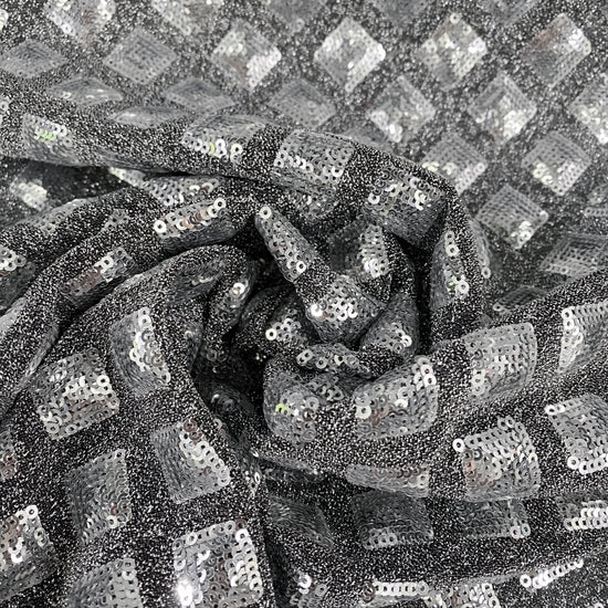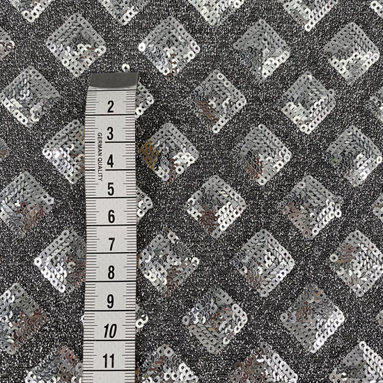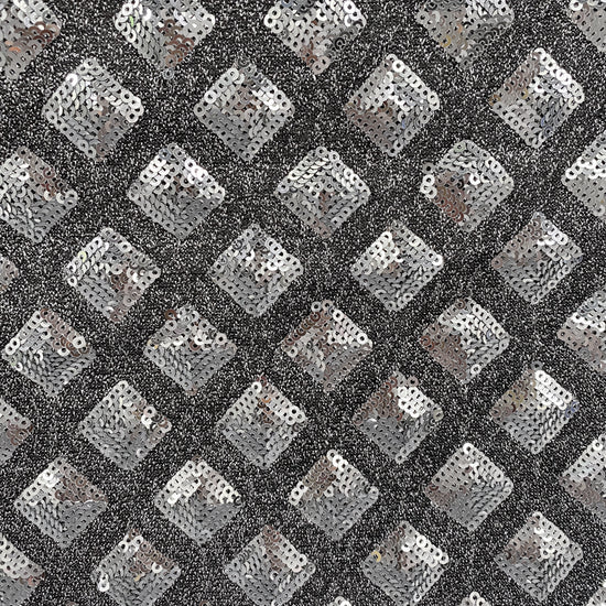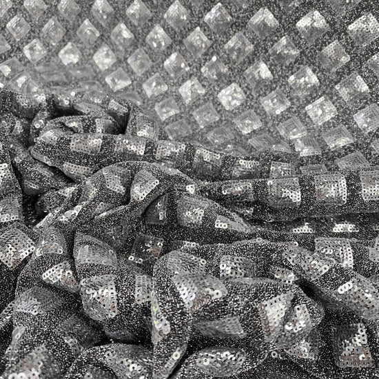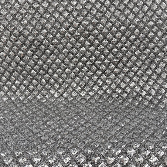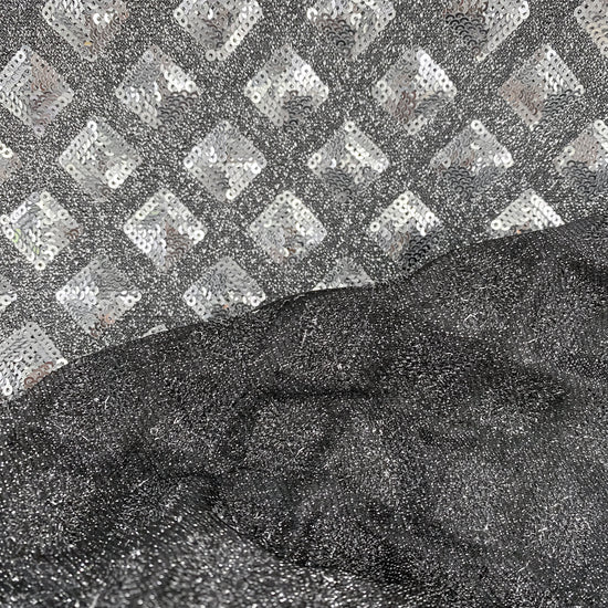 Shiny, sheer backing with a repeating pattern of diamond created out of silver sequins. Flowing drape and lightweight material limited by the structure and weight of the sequins but is still very malleable regardless. Limited stretch. 155cm wide. Polyester and PET. Origin: China.