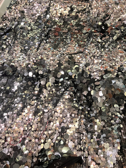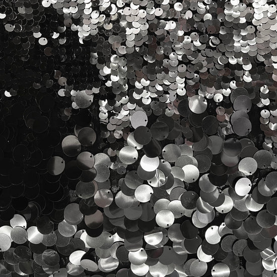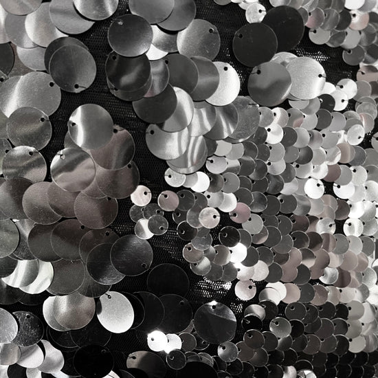 Polyester tulle in Silver/Black. This lightweight tulle has a fine mesh, embellished with layers of metallic sequins, providing an organic, scaled handle. It has an airy drape with a slight structure to it, semi-sheer coverage, and no stretch.