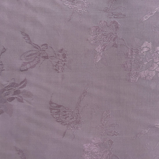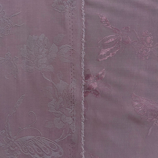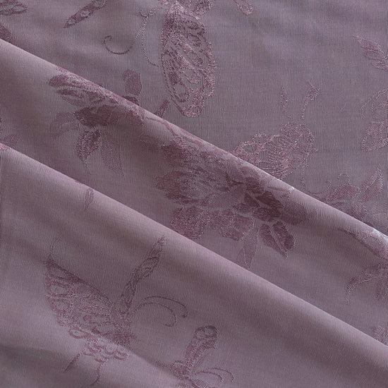 Silk-cotton blend jacquard in Thistle. This lightweight fabric has a tight jacquard weave, featuring silk threaded butterfly motifs on a matte technical face with a finely ridged handle. It has a soft drape, opaque coverage, and no stretch.