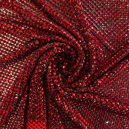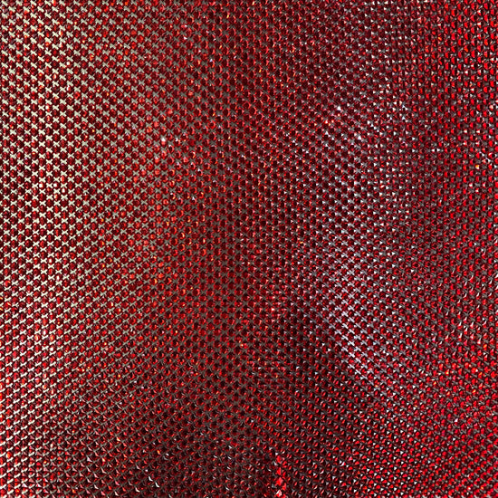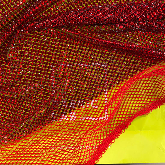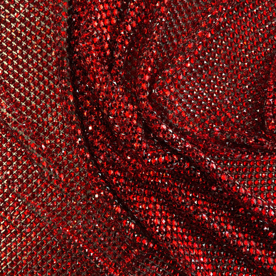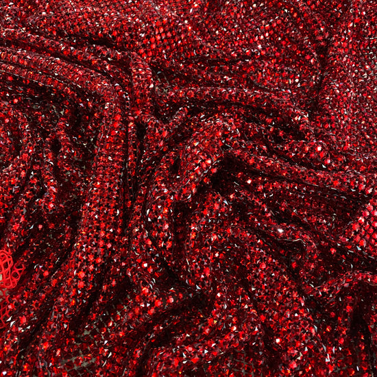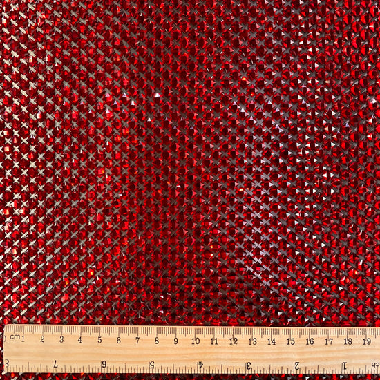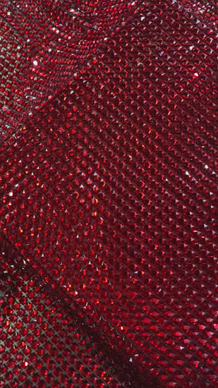 Stretchy polyester fishnet mesh adorned with 5x5mm bevelled square glass rhinestone crystals resembling the shape of princess cut diamonds. Each piece weighs approximately 3-4kg. Two-way stretch.