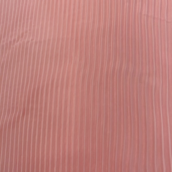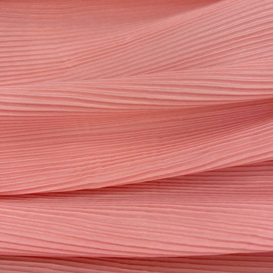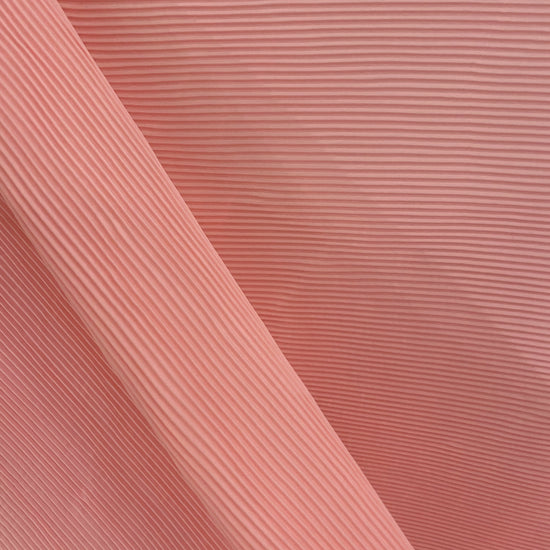 Fairly stiff, but very stretchy, accordion-pleated light pink taffeta. Light to medium weight with a smooth, papery handle. Holds it’s shape well for structural pieces.