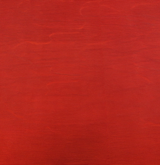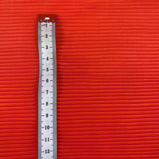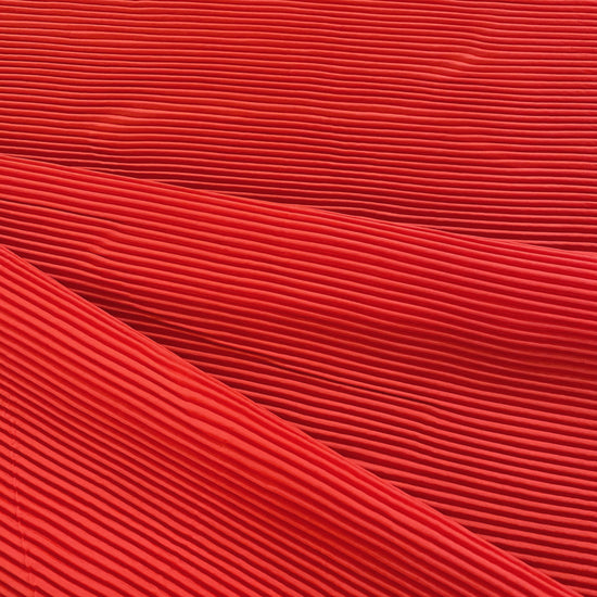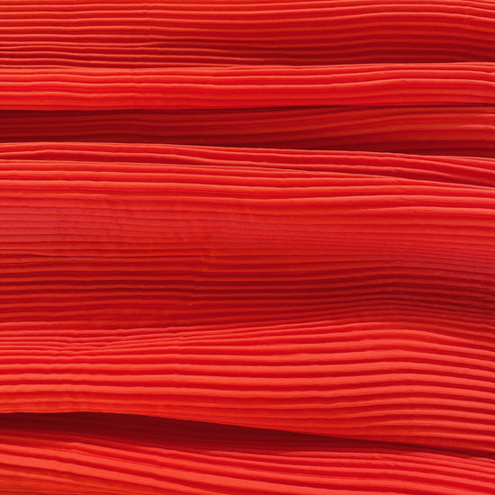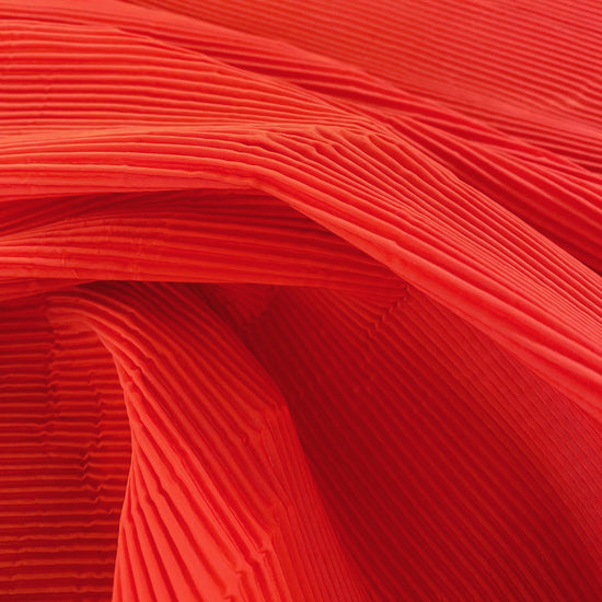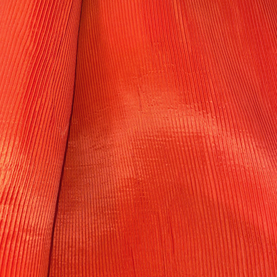 Fairly stiff, but very stretchy, accordion-pleated bright orange taffeta. Light to medium weight with a smooth, papery handle. Holds it’s shape well for structural pieces.