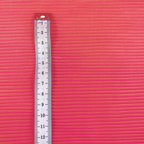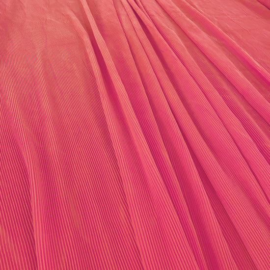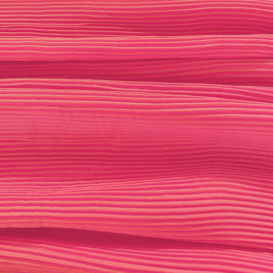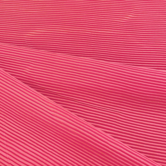 Fairly stiff, but very stretchy, accordion-pleated hot pink taffeta. Light to medium weight with a smooth, papery handle. Holds it's shape well for structural pieces.