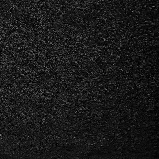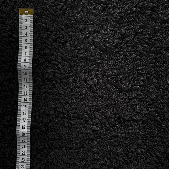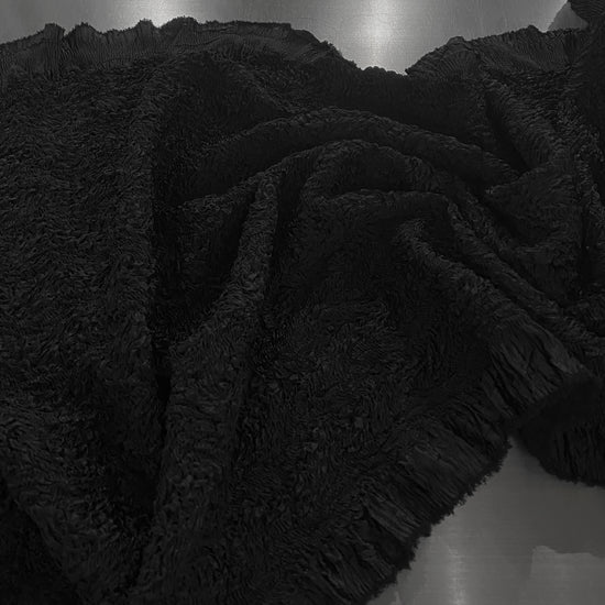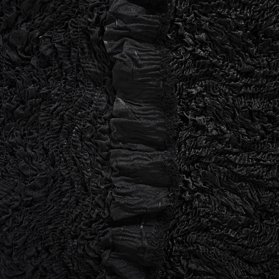 A black polyester satin shirred with elastic yarn in a distorted checkerboard pattern formed by wavy intersecting lines. The technical face of the fabric appears as tight gathers and bubbly 3-dimensional texture.