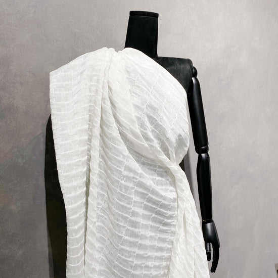 A light to medium weight, semi-opaque, non-stretch double weave with textural stripe repeat and soft yet structured handle and organic textured appearance and minimal drape.