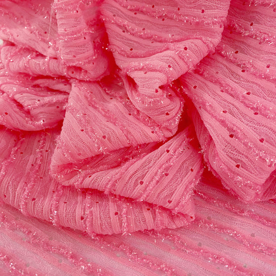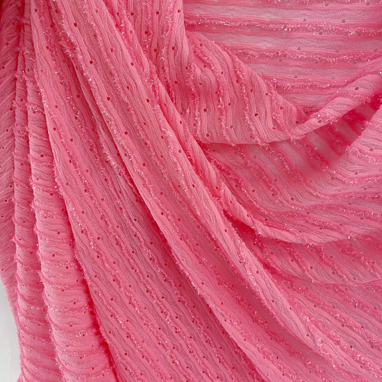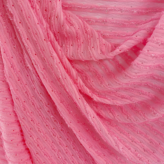 Light weight, semi sheer, sparkly weft knit in bright pink with great drape. Stretch in both the warp and weft direction. Soft metallic handle.