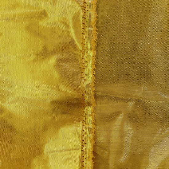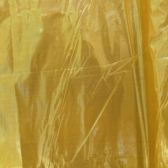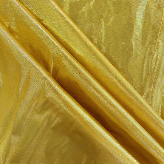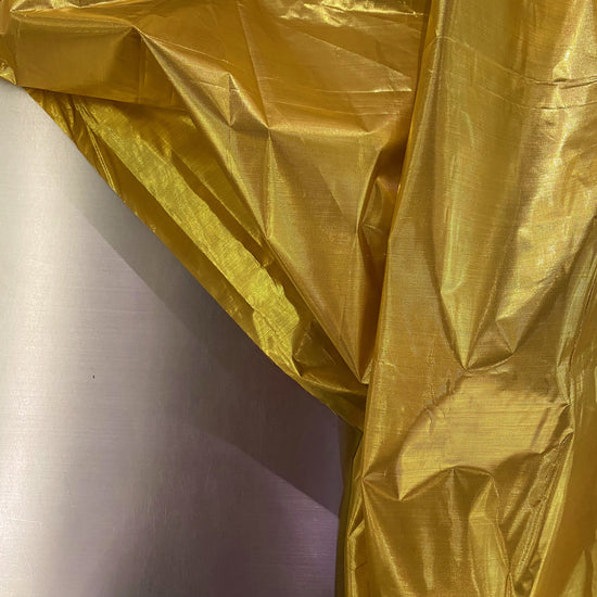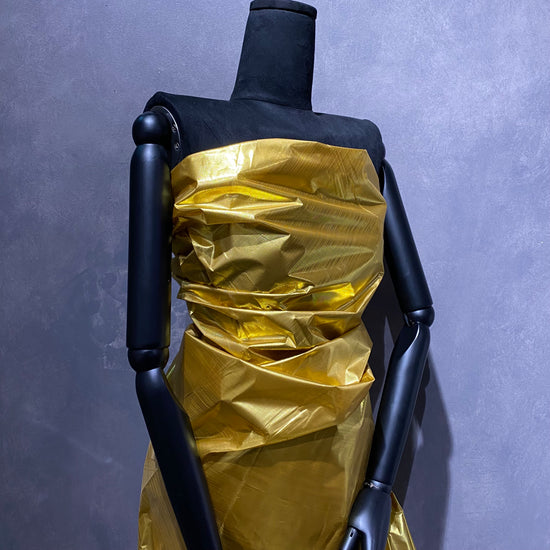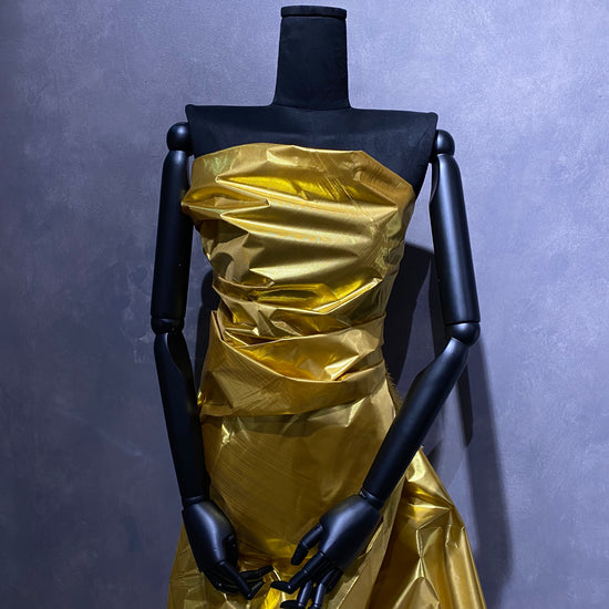 Lamé fabric with a tinsel-like lurex yarn in the warp direction and yellow polyester yarn in the weft direction. A delicate textile that will fringe at unfinished cut edges, with a yellow slub throughout from the looseness of the woven lurex. Crinkly, crisp handle, light weight with a structured drape like wrapping paper. Holds pleats and creases well and has a lustrous metallic finish.