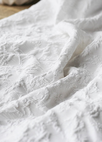 Polyester jacquard in white. This medium weight fabric has a fine jacquard weave with an irregular, rippled handle. It has a soft drape, opaque coverage, and no stretch.