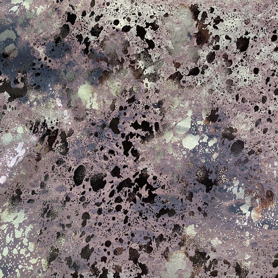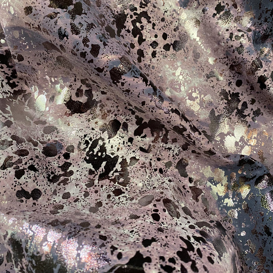 Polyurethane faux leather in lavender/pale violet. This medium-to-heavy weight fabric has a fine, brushed nap with a metallic foiled finish. It has a soft drape, opaque coverage, and slight directional ease.
