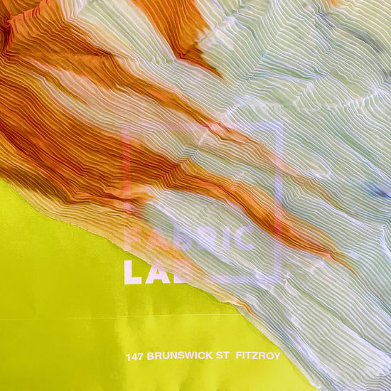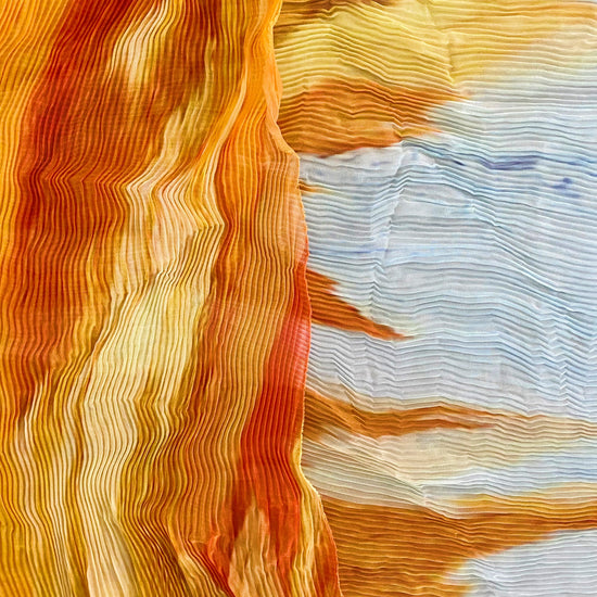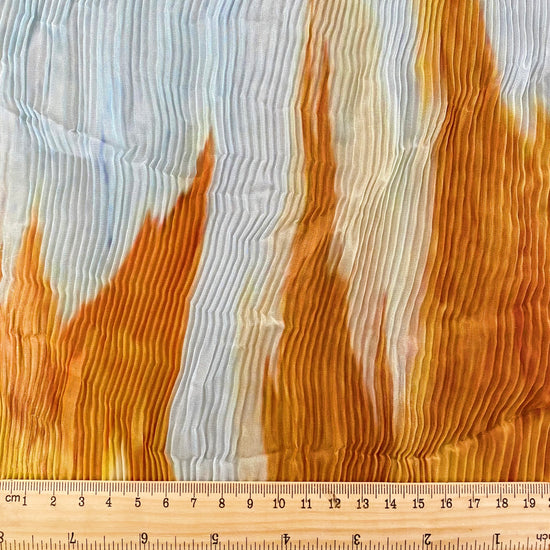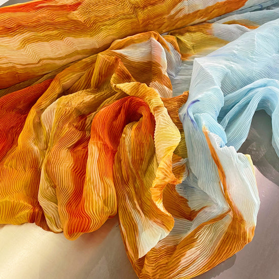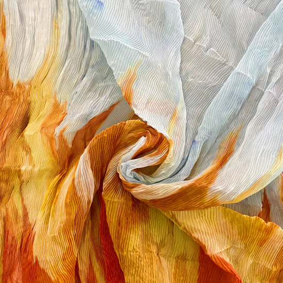 A very light weight, sheer, chiffon plisse with an ombré flame print, great drape, crinkly textured handle, a lot of stretch in the weft direction due to the pleating and moderate stretch in warp direction.