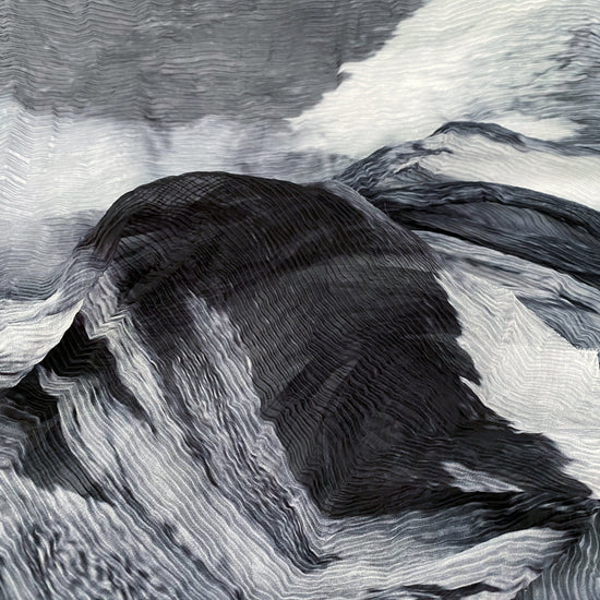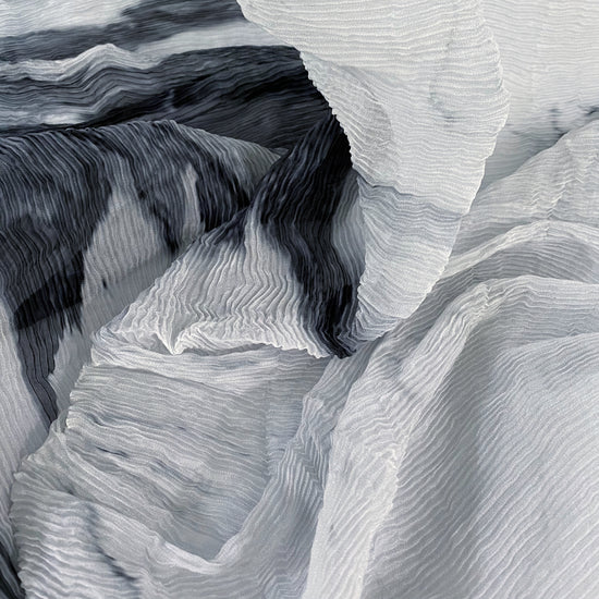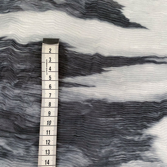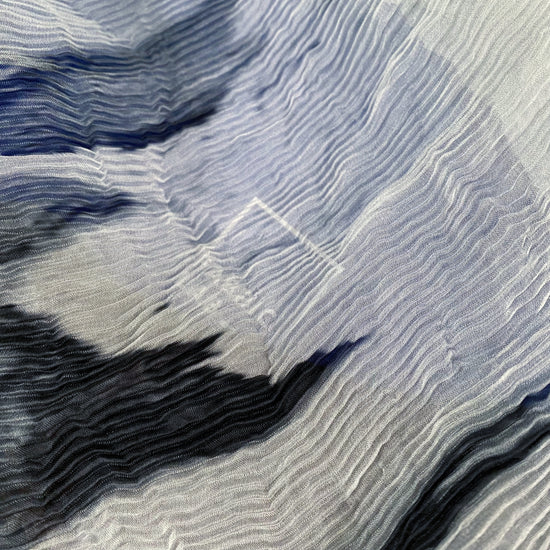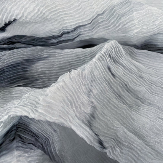 A very light weight, sheer, chiffon plisse with an ombré flame print, great drape, crinkly textured handle, a lot of stretch in the weft direction due to the pleating and moderate stretch in warp direction.