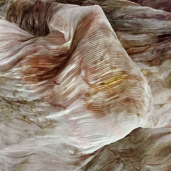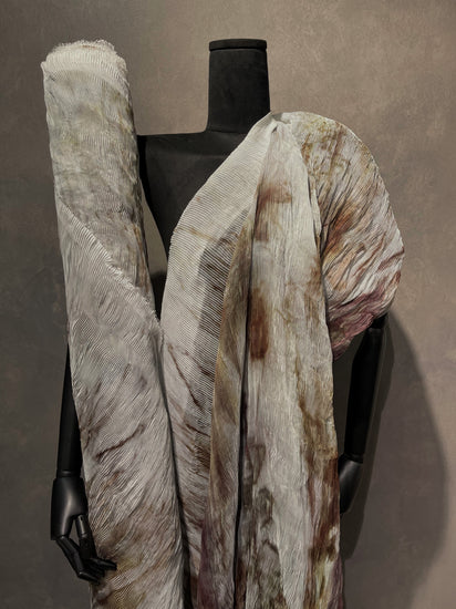 Polyester chiffon in Dark Olive/Mint/Rosy Brown. This lightweight fabric has a fine crepe weave with a fine pleated finish, and an abstract wetland digital print. It has a fluid, bouncy drape, opaque coverage, and elongates across the pleated finish.