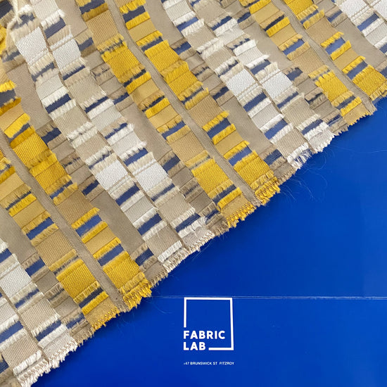 Rectangular geometric checkerboard pattern with a cut yarn float across the weft creating a short fringed pile. Yarn is woven through the organza mesh base in sections to create alternating transparent windows in the fabric pattern. Medium weight, holds some structure, stiff handle and drape, not easily creased.