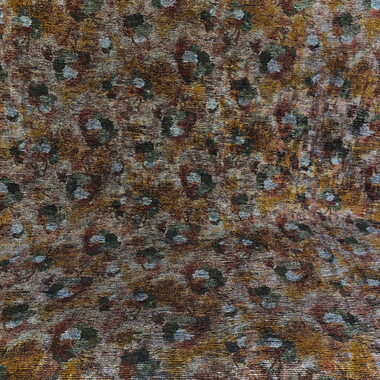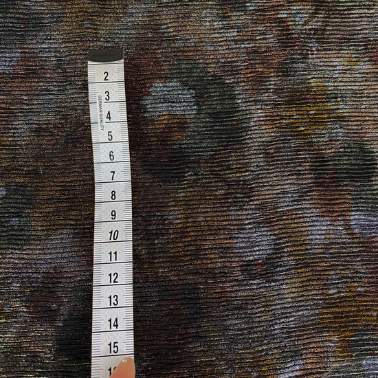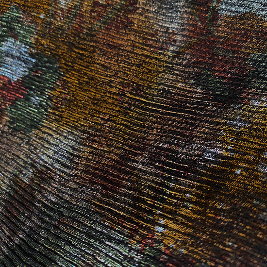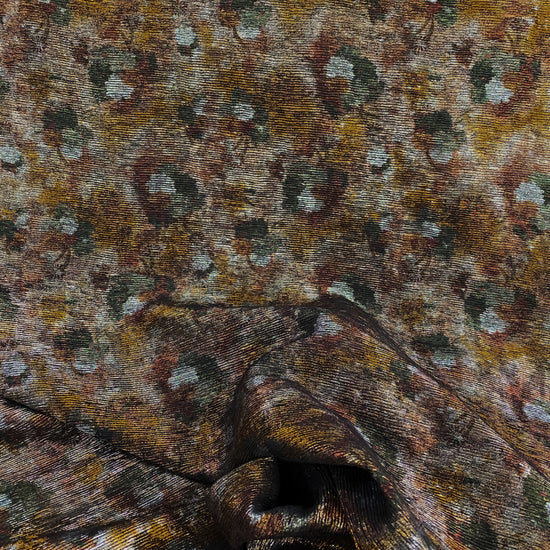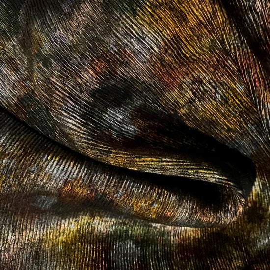 Polyester plain weave plisse with a black base, and a gold foiled floral motif. This medium weight fabric has been tightly woven in a plain weave structure, and treated with a rough, pleated handle. It has a structured, bouncy drape, opaque coverage, and slight ease along the weft.