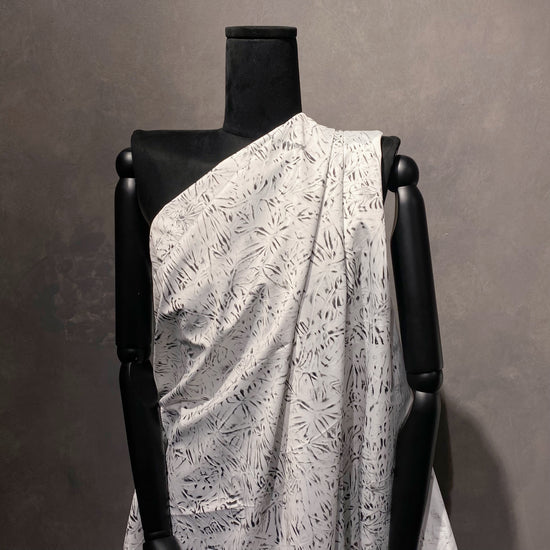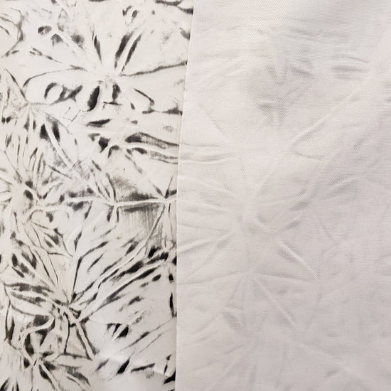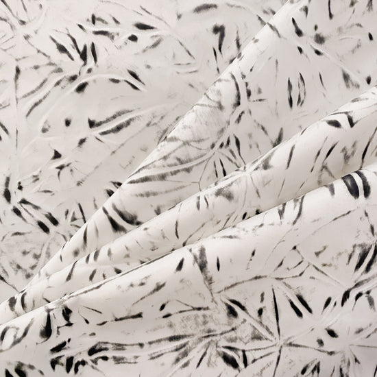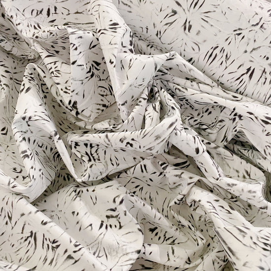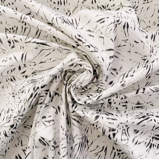 Polyester plain weave in black and white. This medium-weight fabric has been tightly woven in a plain weave structure, featuring a subtle sheen and a paper-like handle. It has a structured drape, opaque coverage, and no stretch.