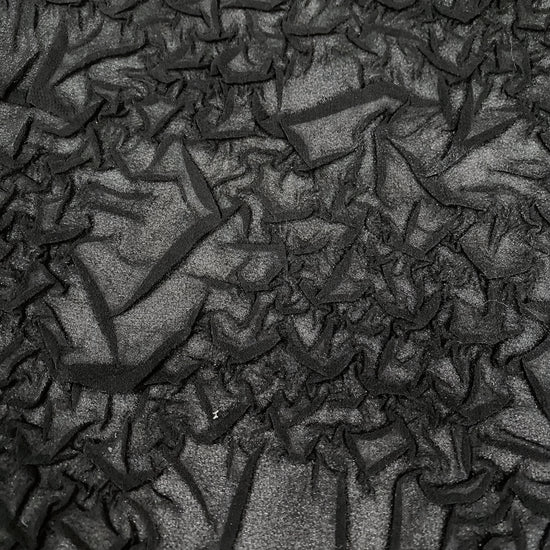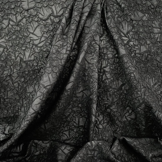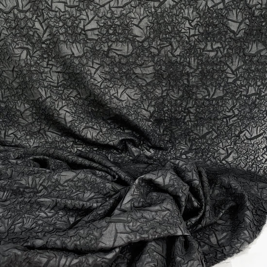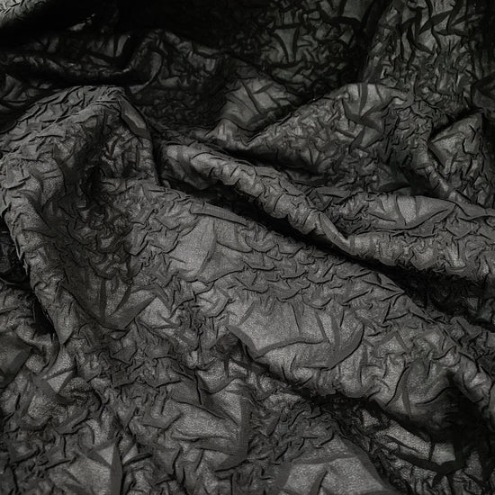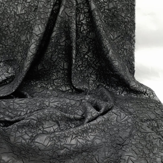 A light weight, semi opaque, crush creased chiffon with some stretch in the weft direction, a warm, soft, textured handle and great drape.