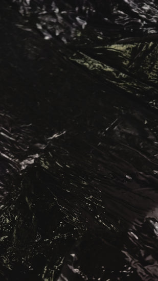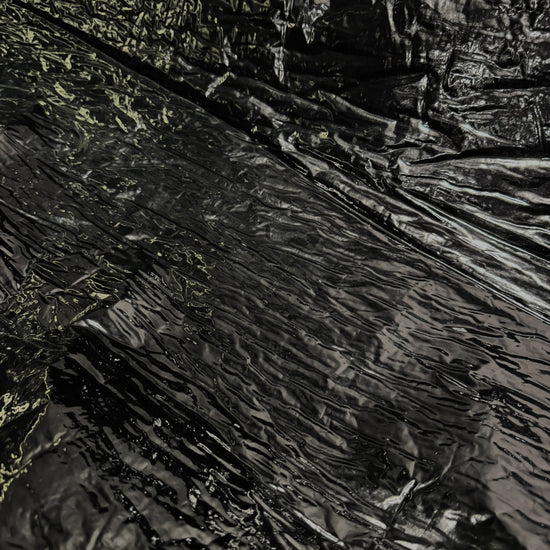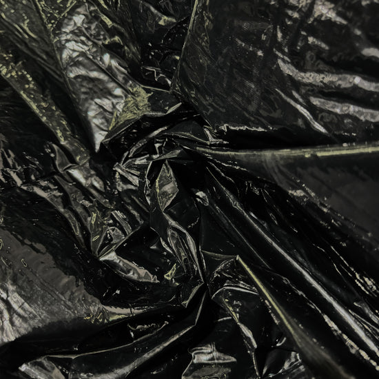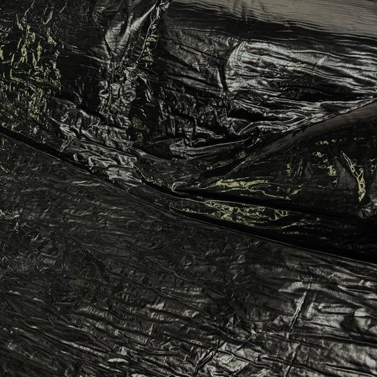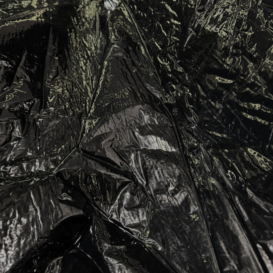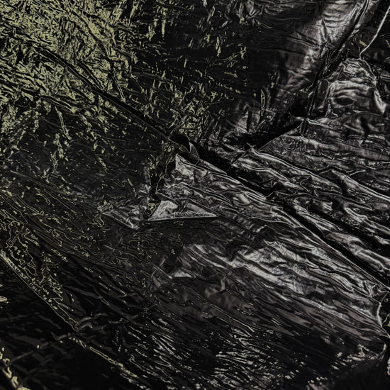 A medium weight, opaque, minimal drape, non-stretch PVC bonded with short pile polar fleece. It has a glossy appearance, and soft, auditory handle